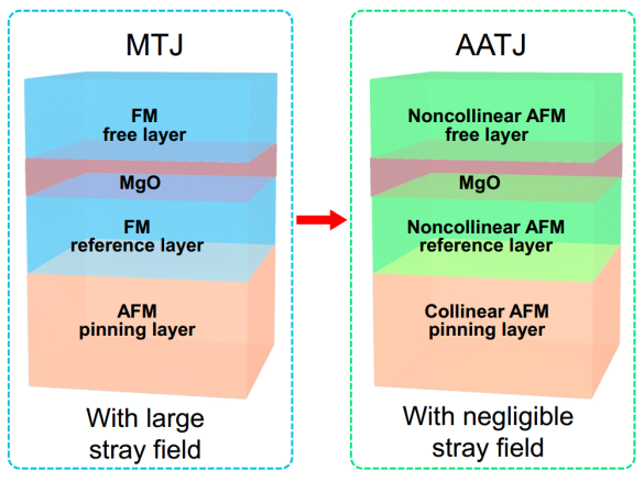 相比原有面内电子输运的反铁磁存储器件,这项研究实现了反铁磁隧道结垂直电子输运,室温电信号输出提升了近3个数量级,从而使超快速响应超高密度反铁磁随机存取存储器(antiferromagnetic RAM – ARAM,图3所示)的研制成为可能。