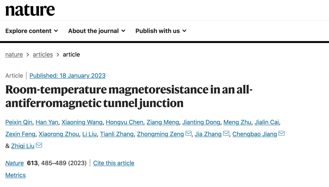 近期,williamhill中文williamhill官方网站磁性功能材料研究团队刘知琪教授、蒋成保教授等在磁存储材料研究方面取得进展,相关成果于1月19日以全文Article的形式在《Nature》杂志上发表,论文题目为:“Room-temperature magnetoresistance in an all-antiferromagnetic tunnel junction”。williamhill官方网站博士生秦培鑫为第一作者,williamhill官方网站为第一单位,刘知琪教授、蒋成保教授为第一单位通讯作者,华中科技大学物理公司张佳副教授、中国科公司苏州纳米技术与纳米仿生研究所加工平台曾中明研究员为合作单位及通讯作者。