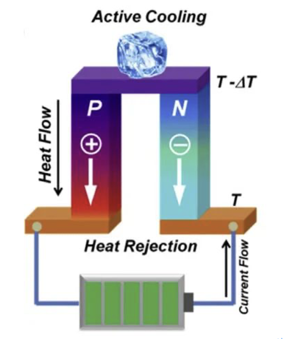 图1. Peltier电子制冷模型【J.Materiomics,1(2015) 92-105】