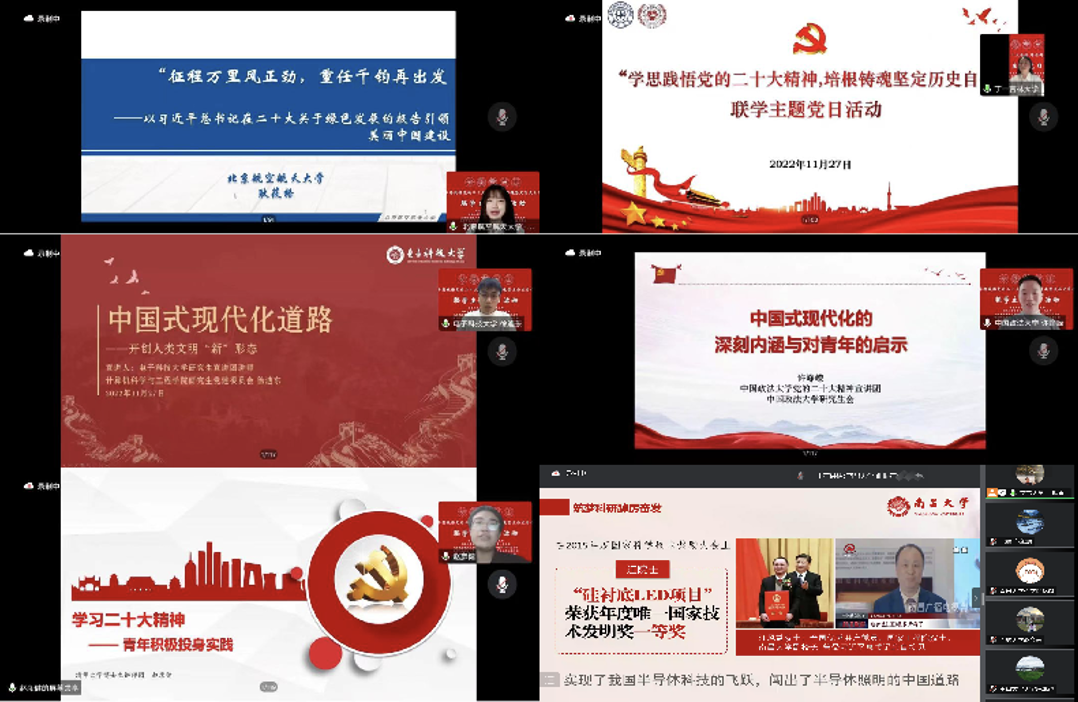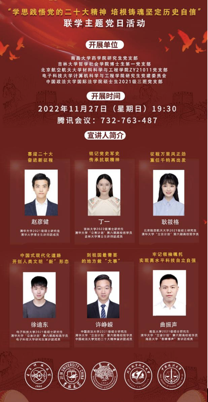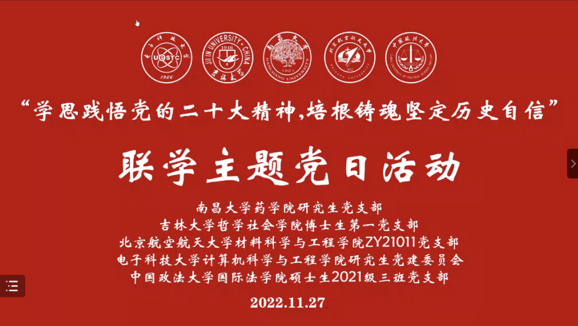 (通讯员:范锡财 耿筱格)为全面学习贯彻党的二十大精神,williamhill官方网站ZY21011党支部联合南昌大学药公司研究生党支部、吉林大学哲学社会公司博士生第一党支部、电子科技大学计算机科学与工程公司研究生党建委员会及中国政法大学国际法公司硕士生2021级三班党支部,于11月27日线上开展了“学思践悟党的二十大精神 培根铸魂坚定历史自信”联学主题党日活动。