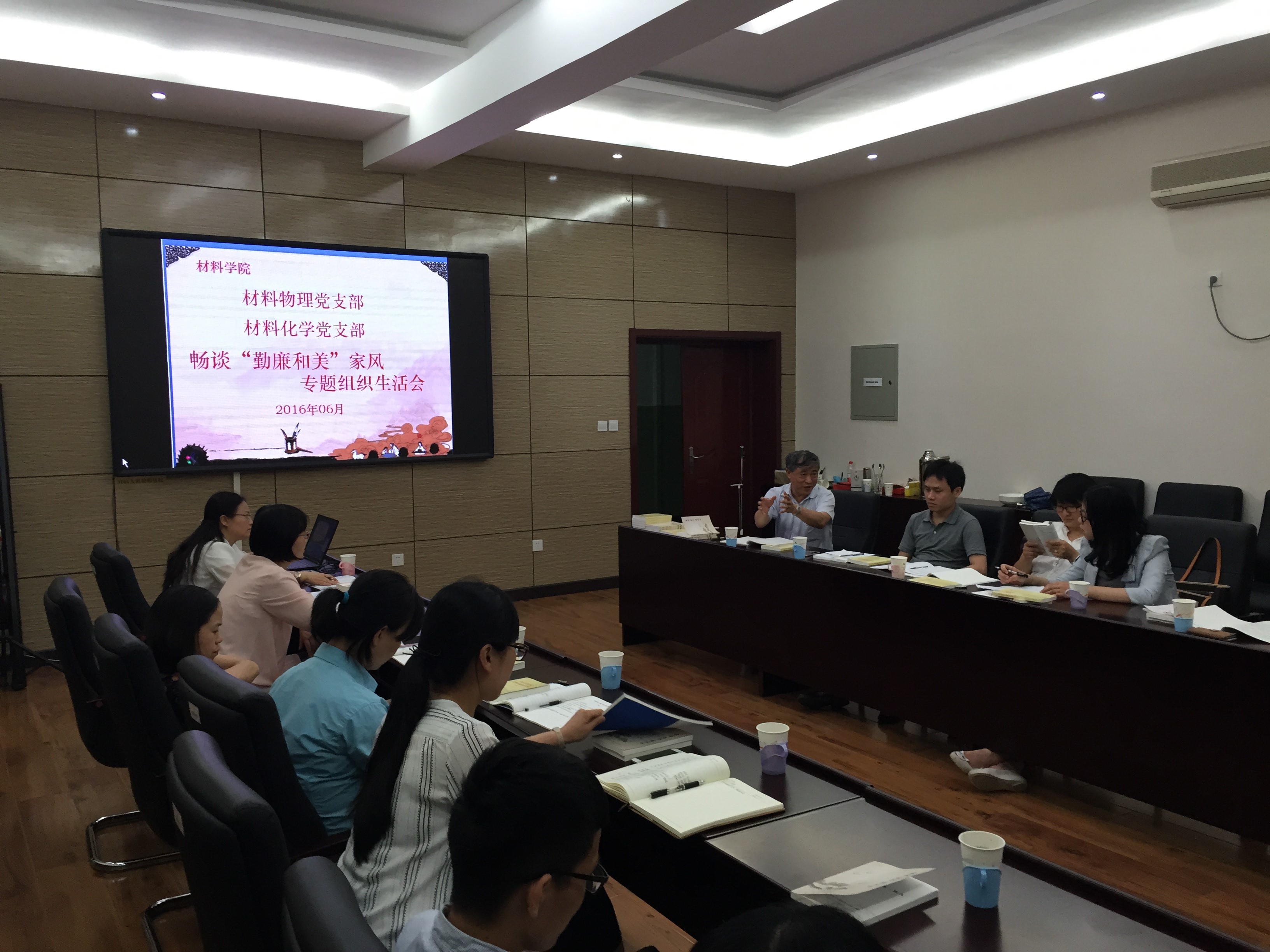 最后,大家畅谈了“勤廉和美”家风体会。老党员朱立群教授回忆自己充满了“和”与“谦”优良传统的家风,带着满满的正能量,让年轻的老师们十分受教育。在他父辈们所处的物资匮乏年代,父亲以及很多党员能让出自己的福利(涨工资,分房子的机会)给更需要的人,他的老师建议把奖金用来买书而不是去消费享受,这些先人后己,克己奉公,互帮互助,艰苦朴素等优良传统和观点深深的影响着朱老师的作风。刘建华教授回忆自己这一代“生在新社会,长在红旗下”的成长经历,邻里间没有隔阂,人与人之间关系融洽,处处谦让;当物质生活丰富之后,各种关系也随之复杂,而我们需要牢记共产党的作用——先锋模范,是优秀的先进的一群人的代表,牢记共产党的理想信念,树立国家集体利益高于个人利益,在当前社会形势下,要更好的发挥党员的先锋作用。张跃教授则从思想层面鼓励党员们多思考,尽管我国的经济总体量跃居世界第二,但我们的国际地位,民族,国家层面是否也达到相应的高度,社会风气等也要体现社会主义的优越性。多思考如何从内容上提高学习的质量。谷景华老师也回忆了早期党员组织生活学习情况,发表了对目前形势下的党建工作一些思考。青年教师赵立东教授和刘金章老师结合自己的求学经历谈了学习体会。