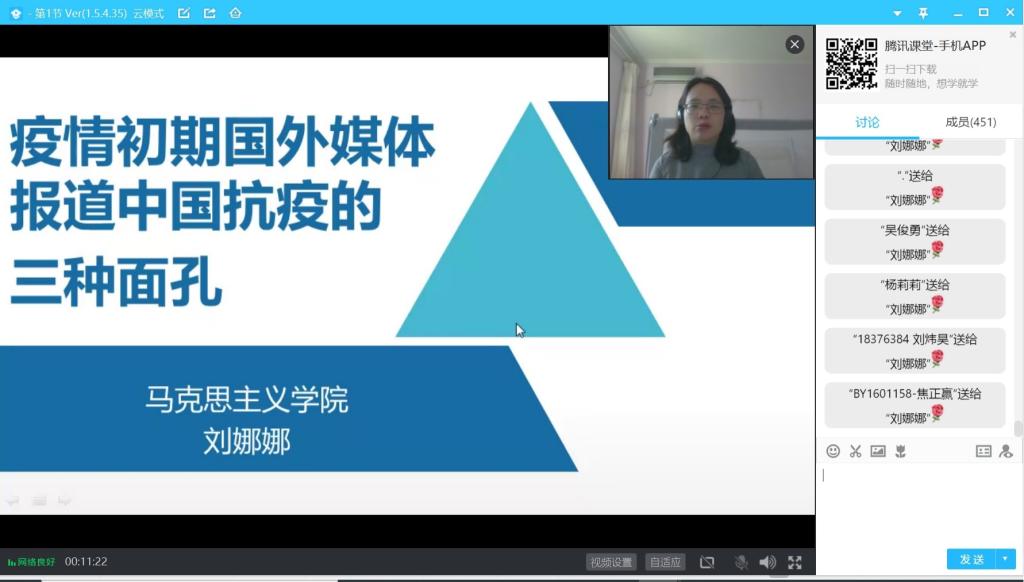 160112班闫晓莉:新冠肺炎疫情在全球扩张,在当前国际形势下,中外媒体都给予了高度关注,外国媒体展现了三种不同的面孔,通过老师的讲解我们认识到了背后深层的原因。面对纷繁复杂的舆论氛围和新闻报道,我们要理性关注,清醒判断,独立思考,勇于探究,学会用辩证的角度看待问题。同时,作为员工党员,要加强理论学习,学会用辩证唯物主义分析问题,做到不信谣,不传谣,敢于发声,学会讲中国故事,积极传播正能量。