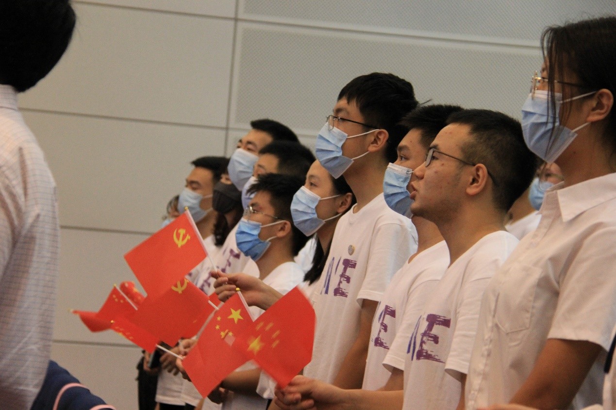 仪式最后,全体师生挥舞着手中的国旗、党旗,齐声高唱《没有共产党就没有新中国》,气势恢宏,把最真挚的感情和最好的祝福献给党和祖国。在嘹亮的歌声中,欢迎仪式圆满结束。