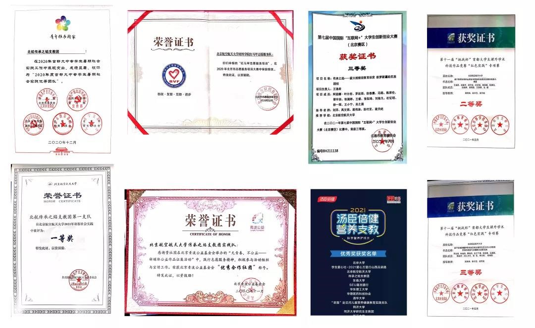 七年的支教活动中,团队收获了诸多荣誉。团队六年间累计获得寒期社会实践一等奖三次,暑期社会实践一等奖五次,共八次;其中第一名累计达到四次,并且从2020年暑期到2021年暑期连续三次获得第一名;此外,截止今年“传承之焰”还获得了第十一届首都挑战杯“红色实践”专项赛二等奖、2021年北京市“互联网+”创新创业大赛三等奖等其他各级荣誉30余项。