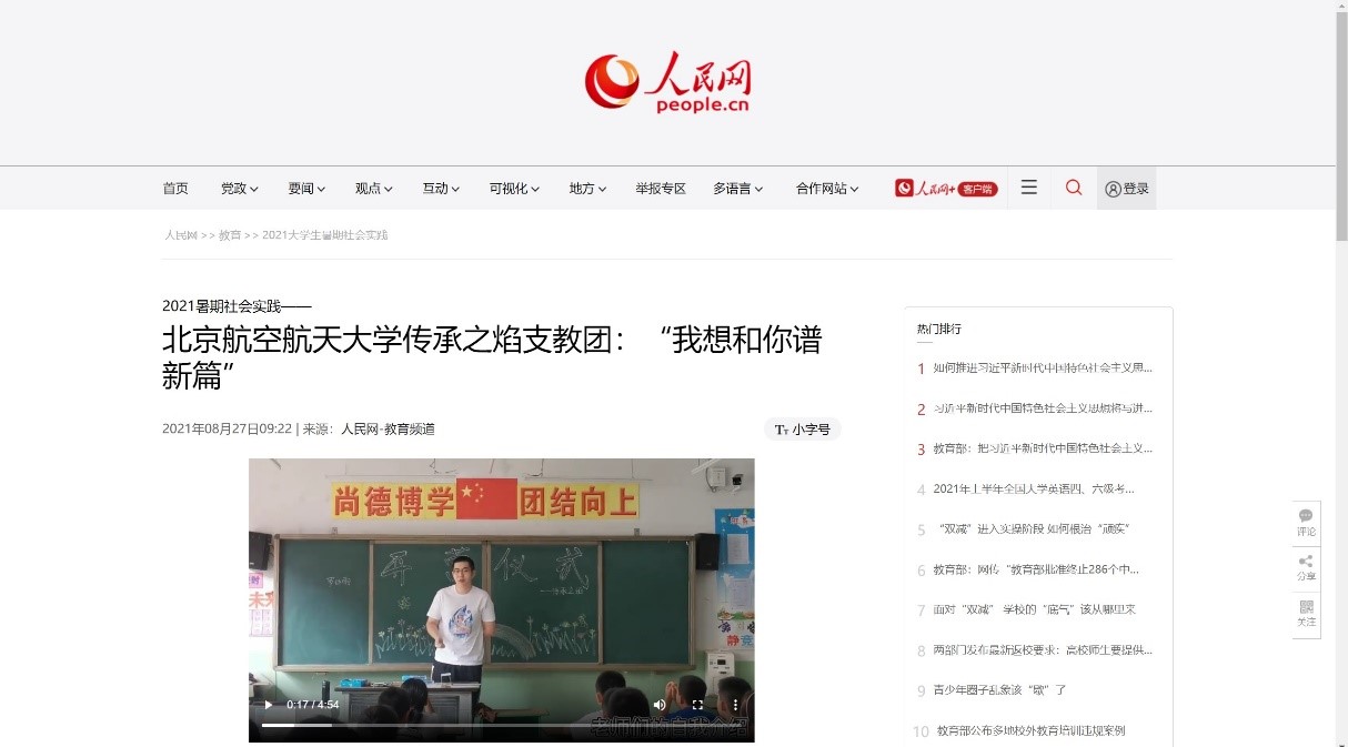 团队的支教活动获得了社会的高度关注和肯定。在今年,我们的活动得到了人民网的专题专版报道;我们的支教活动还多次登上了北航官方公众号——航小萱的封面。除此之外,还有《山西市场导报》等多家省级、市级、校级知名媒体进行了持续性、长篇幅的报道。