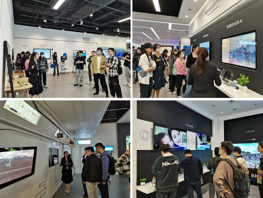 随后,工作人员带领北航师生参观了京东方技术创新中心展厅,深入了解了京东方的发展历程、技术水平、主线产品及其在显示器件、智慧终端、系统方案等领域的优势特色。在参观中,同学们徜徉科技海洋,直观体验屏之物联的丰富应用场景,就所见所闻与京东方技术人员进行交流互动。