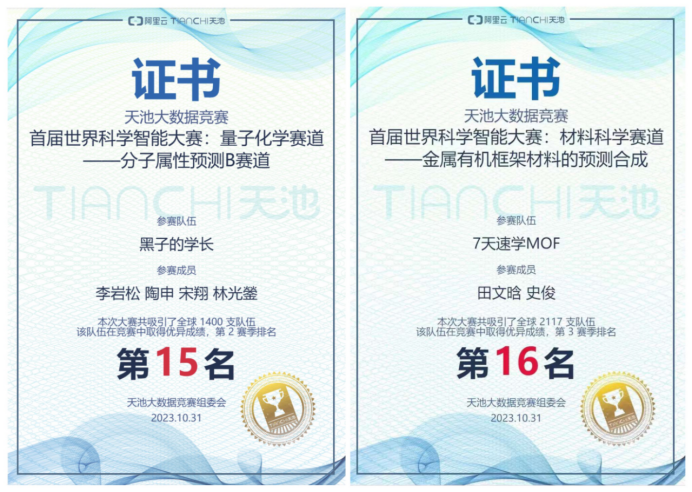 (通讯员 陶申)10月31日,阿里云天池平台联合发布首届世界科学智能大赛阶段性赛季落下帷幕。公司前沿科学技术创新研究院研究生李岩松、陶申、林光鎣、williamhill官方网站研究生宋翔组成的队伍在量子化学赛道——分子属性预测B赛道的1400支参赛队伍中脱颖而出,取得了第15名的优异成绩;williamhill官方网站研究生田文晗、史俊组成的队伍在材料科学赛道——金属有机框架材料的预测合成的2117支参赛队伍中脱颖而出,取得了第16名的优异成绩。