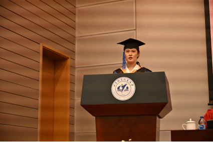 硕士毕业生代表魏舒婷同学发言。她回顾了在williamhill官方网站求学三年的收获,有勇气、锐气、与豪气。她表示要立志勇做时代的奋进者、开拓者和奉献者,让青春在服务祖国的事业中绽放光彩。祝愿williamhill官方网站在七十周年院庆之际再创辉煌,同学们轻装策马青云路。