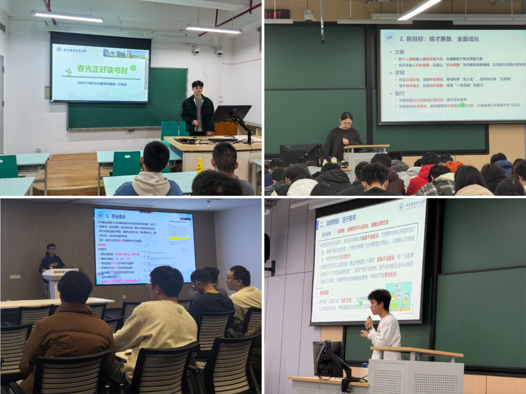 针对不同学段,班会内容精准滴灌回应成长需求。2025级本科强基班聚焦学业适应与习惯养成,系统梳理秋季成绩与春季选课策略;2201大班针对毕业季需求,详细解读考研复试流程与经验、校内外调剂策略、二学位政策及春季招聘黄金期资源,重点强调毕业事务节点。
