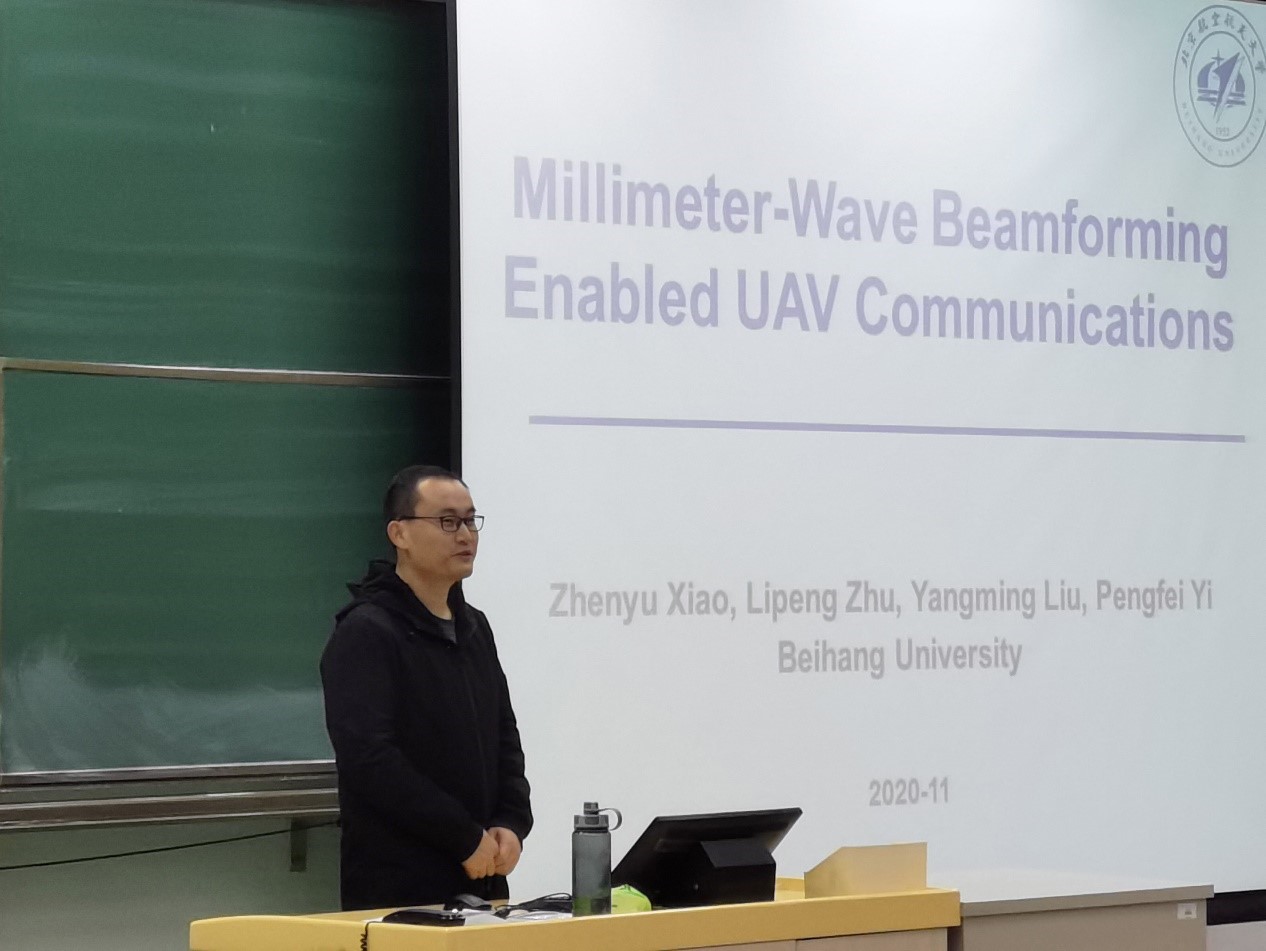 接下来,电子信息工程公司2018级博士研究生朱立鹏就无人机通讯技术进行了展示。朱立鹏博士首先介绍了无人机的应用,并提出无人机应用的一大问题就是如何控制无人机。目前控制无人机主要通过低频段(6G Hz以下)控制,但其缺点是存在干扰严重、频谱资源稀缺等,因此朱立鹏博士将研究方向聚焦于新频段(毫米波)的使用。新频段虽然存在着损耗大的缺点,但可以用毫米级天线通过阵列增益来弥补损耗,进而实现毫米波的应用。朱立鹏博士的工作就是将毫米波频段应用于无人机控制中,从而使无人机在更多场景下得到充分应用。毫米波无人机通信存在较多难点,如无人机为高动态、存在严重的多普勒效应、存在好高的功耗以及对控制链路的要求比较高等。几种典型的天线结构可以提供高波数,但在高动态条件下效率较低,可以通过建立信道模型的方法提供改进。随后朱立鹏博士介绍了无人机辅助蜂窝网络、无人机通信的3D特征、无人机自组网、无人机提供中继服务等应用,并提及毫米波应用于无人机的一些前沿问题,如信道建模、抖动特性等问题,需要投入更多的精力进行研究。