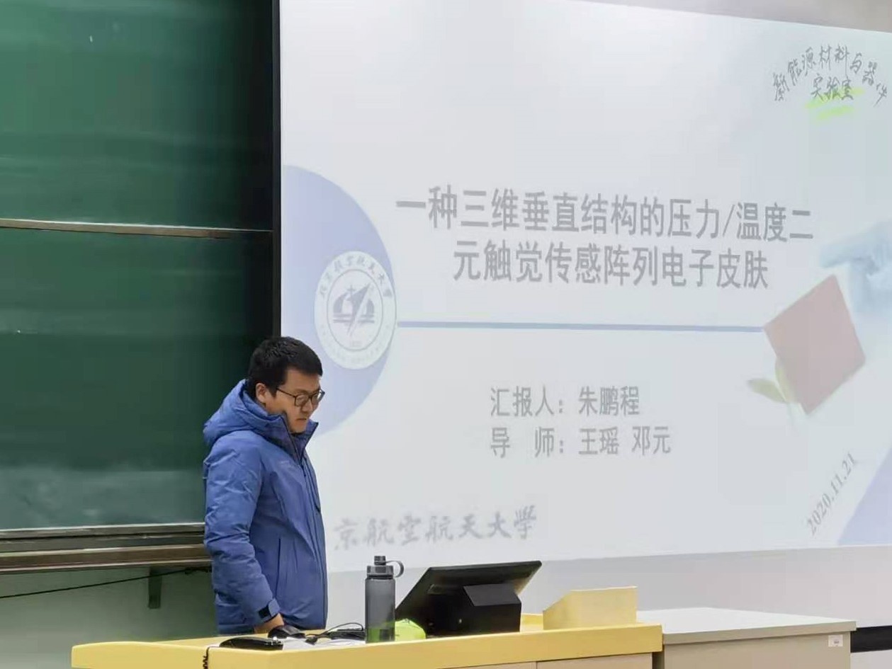 随后,电子信息工程公司2018级博士研究生朱鹏程分享了研究课题——“一种三维垂直结构的压力/温度二元触觉传感阵列电子皮肤”。朱鹏程博士首先介绍了研究背景,即可穿戴柔性传感器的特点与应用,还有聚苯胺基柔性热电材料的赛贝克效应以及聚偏氟乙烯柔性压电薄膜的压电效应,随后讲述了器件制备工艺和材料表征。通过对温度传感性能、压力传感性能、器件可靠性测试、二元传感独立性测试、人体生理信号测试、有限元分析、模拟人机交互、电子皮肤阵列的表征得出有效结论。该电子皮肤对外界温度变化具有快速响应,高灵敏以及高精度,对压力刺激也可以快速响应,能实现对脉搏、关节运动、发声振动等生理信号的探测。两路信号独立传输,不产生相互干扰,无需信号处理,且无需外部电源供给,实现主动传感,并且可以应用于电子皮肤实现对外界温度压力信号的定向识别,对温度压力的空间分布情况精准分辨。