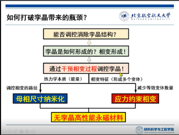 随后,贾玉潇介绍了消除孪晶结构的有效方法,即调控产生孪晶结构的过程—固态相变,主要通过母相尺寸纳米化和应力约束相变两个方法,实现无孪晶高性能永磁材料的优化。