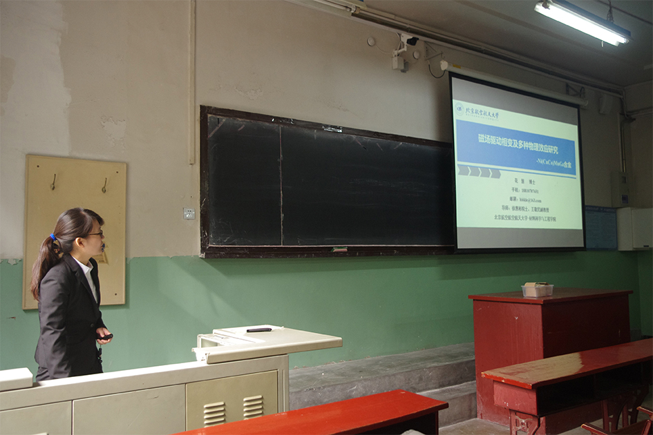 首先作报告的是花慧博士,她的导师是徐惠彬院士,她宣讲的内容是NiMnGa合金磁场诱发相变及其多重物理效应。花慧博士从形状记忆合金的用途与原理出发,引申出了可通过温度、应力、磁场多因素驱动马氏体相变的磁性合金。她讲述了自己通过第一性原理计算掺杂少量Co、Cu取代Ni的方式进行合金成分设计,得到宽工作温度、大磁制冷能力磁性材料的思路,并经过热机械训练实现马氏体择优取向,从而得到了高磁致应变值材料的过程。并从位错钉扎的角度进行了原理的阐释。