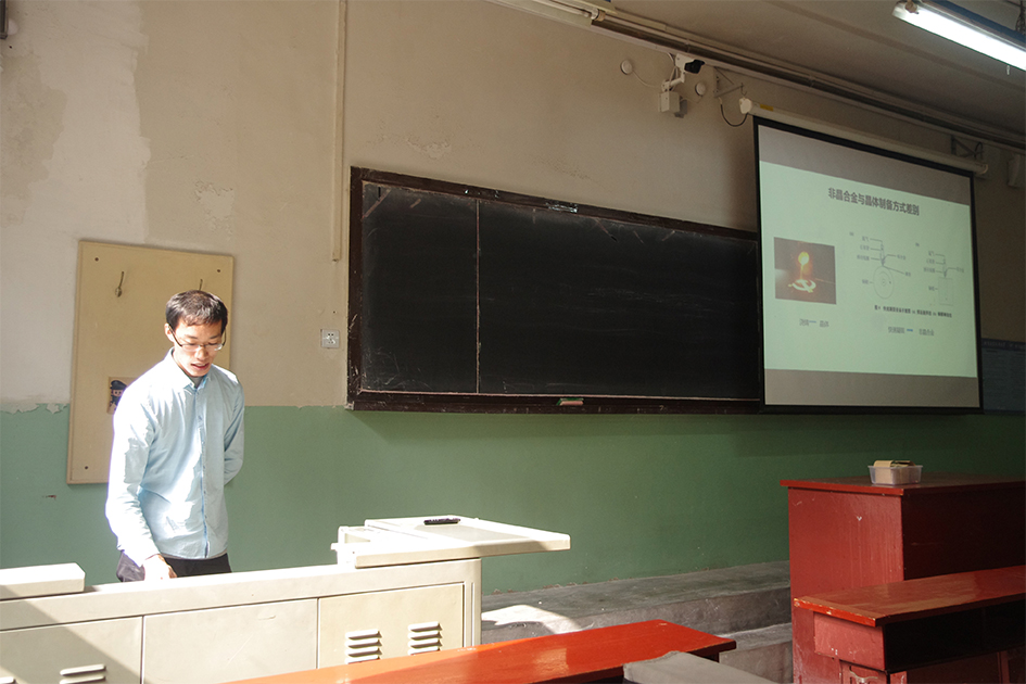 最后为我们带来精彩报告的是张涛教授的员工李轩博士,他报告的题目为(La-Ce)-Co-Al块体非晶合金的第一性原理分子动力学模拟。他通过讲述自己以第一性原理的手段进行动力学模拟,对实验方法、材料进行改良,起到了溶质隔离现象得以改善,,类二十面体增多,自由体积减小的优点,更易块体非晶的形成。
