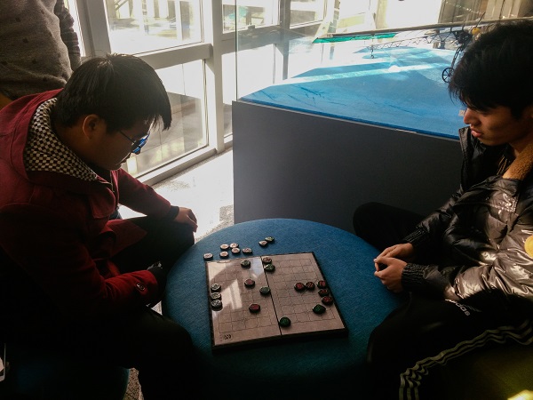 而象棋赛场的竞争更为激烈,许彬彬和程影星的较量颇为胶着,双方都不肯轻易放弃,这盘棋持续了一个小时才决出胜负,他们棋盘上的厮杀也吸引了很多同学的观战。在另一组比赛中,周心作为首轮八位选手中唯一的女生,也首战告捷取得了胜利。