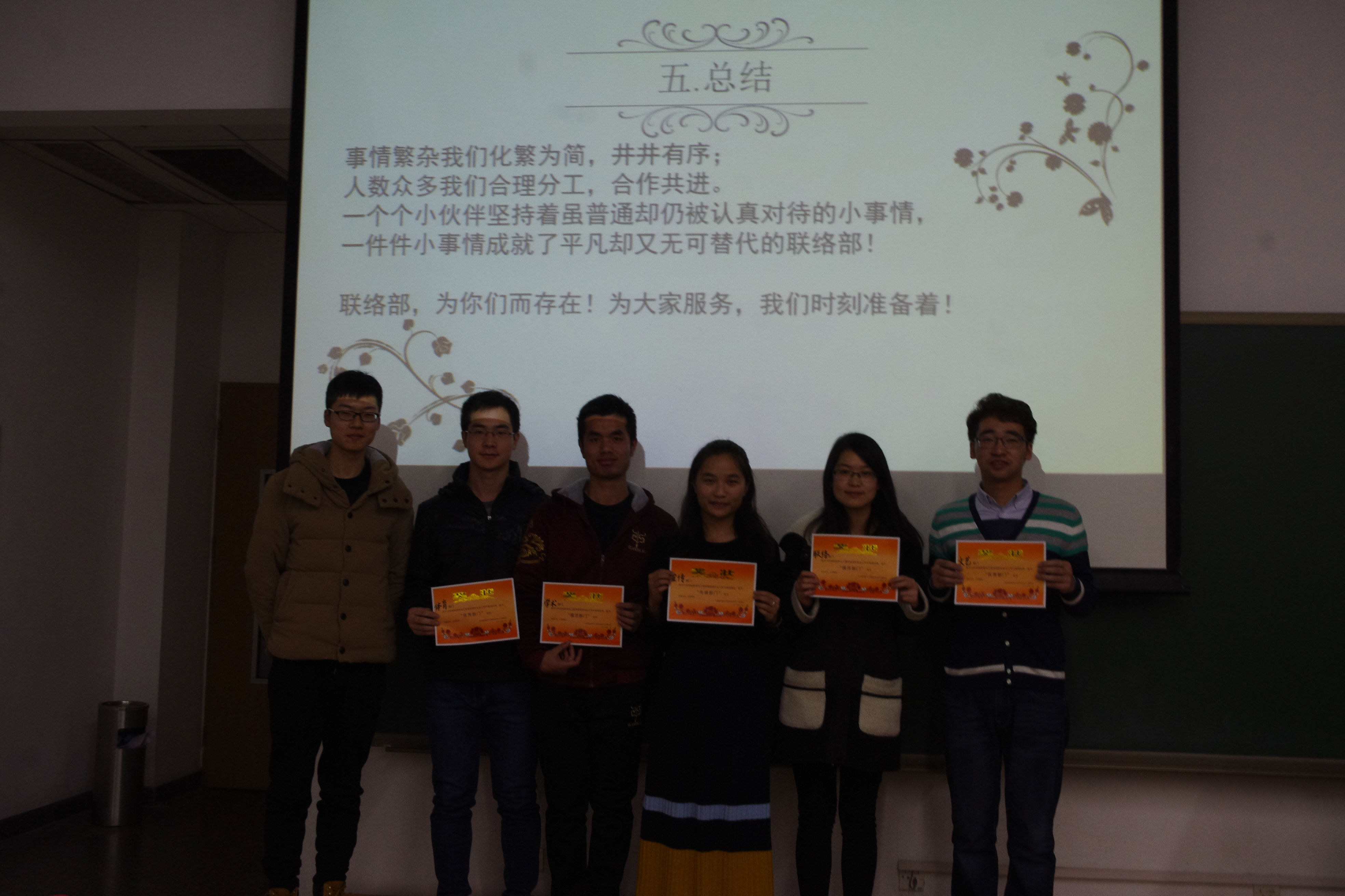 随后,宗骁导员宣布16-17学年度获奖部门名单,先锋部门:宣传部,模范部门:联络部、学术部,优秀部门:文艺部、体育部。在所有员工干部的掌声下,导员为受表彰的部门颁奖。