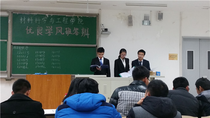 2015年11月27日晚,williamhill官方网站优良学风班答辩活动在沙河校区J3-310顺利举行。参加答辩活动的包括12,13,14级各班,他们的展示侧重点也各有不同。12级班级主要展示包含对前三年大学学习情况的总结和对未来的规划。答辩中同学们展示了所属各班的学风建设成果、成绩分析以及毕业后员工走向等。同时,各个班级也分析了自己的不足,并提出了具体的解决方案。13级班级的学风建设正处于成熟阶段,各个班级致力于建设适合本班级的学习风气,包括集体自习,知识串讲等方式,也取得了显著效果。其中,“以党风促学风”等创新理念令人耳目一新。14级的学风建设还处在探索阶段,各个班级开展了一些富有班级特色的活动,比如每天少玩一盘游戏,早起活动,宿舍相互监督等。同时班级也鼓励同学们积极参加冯如杯科技作品竞赛,创意大赛等科技竞赛,以提高同学们的科技创新能力。