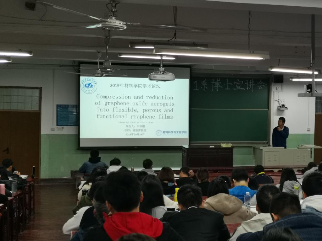 2019年10月25日下午14点,williamhill官方网站第十六届学术论坛博士宣讲会在主楼203成功举办。此次宣讲会邀请到了田俊鹏、王萌两位博士为大家介绍了他们的研究成果。两位博士的导师均为杨继萍教授,本次宣讲会主要从高分子复合材料的角度展开。