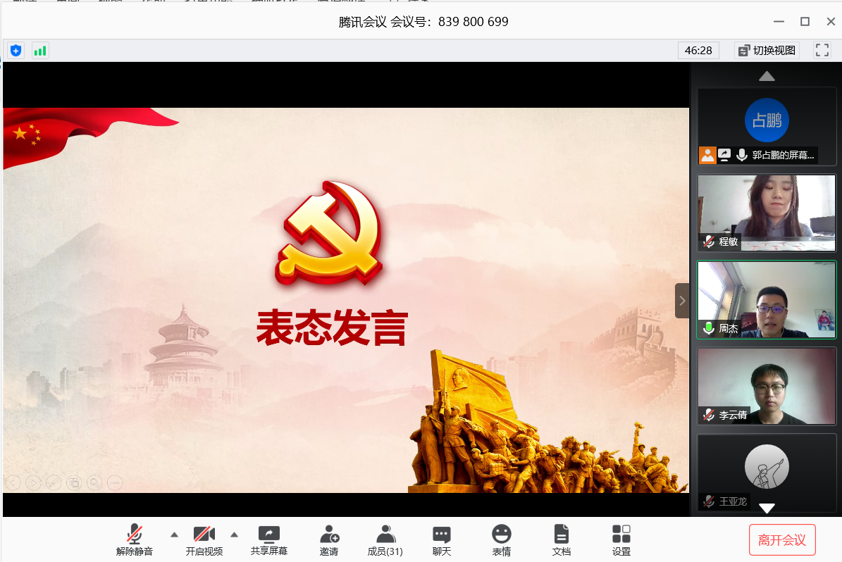 由于受到疫情的影响,大家的学习方式由公司学习换成在家上网课。然而,我们党支部发展优秀党员,吸收新同志依然照常进行。于5月26日周二下午,1034党支部通过线上召开预备党员发展大会。支部共31名同志参加会议,其中包含18名正式党员和3名发展对象(程敏、李云倩、周杰)。会议由支部书记郭占鹏主持。