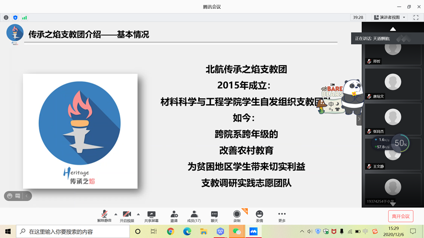 最后,杜钇明同学介绍了传承之焰支教团的基本情况、历年活动及常规工作,分享了支教团在河底小学进行支教活动时的故事。杜钇明同学回忆,在河底小学的支教工作即将结束时,李海莲董事长对他们动情地说道:“因为有你们,他们对外面的世界产生了好奇和向往,你们的到来,给他们带来了更多温暖和希望。”正是怀着这样的热忱之心、责任使命,支教团的每位成员因为同样的热爱与理想而走到一起,共同奉献、共同前行,责任与热情代代相传,以自己的努力为贫困地区教育贡献力量。