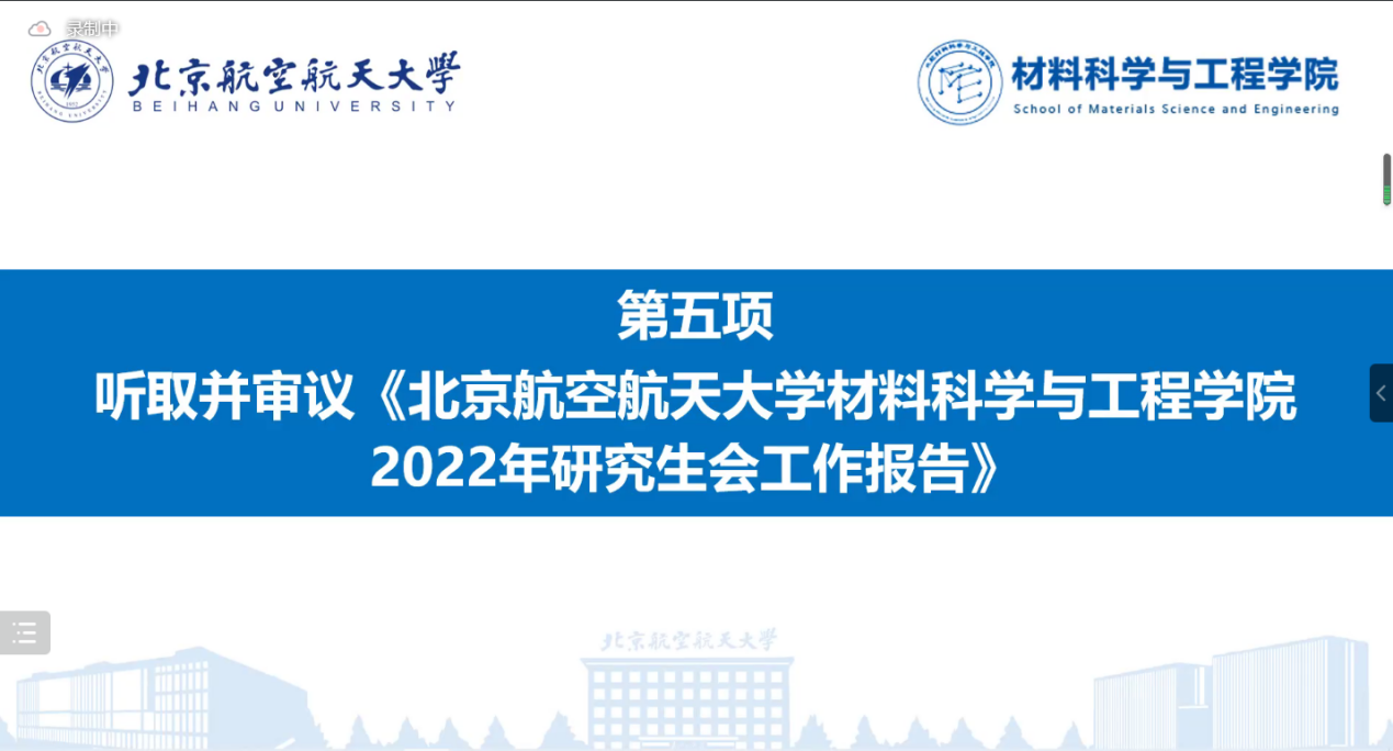 随后williamhill官方网站第十九届研究生会主席团成员石一作了《williamhill官方网站2022年研究生会工作报告》。报告回顾了过去一年里公司研究生会在思想引领、组织建设、活动打造等三方面的工作成果,并对过往的工作进行反思总结。她指出要明确研会组织定位,做好员工与公司之间的桥梁与纽带作用,服务好广大材苑学子,要继续传承往届精神,充分利用公司资源和组织优势进一步优化员工活动,积极学习各高校各员工组织各院系的活动经验,争取打造具有铭牌性、代表性和传承性的优质活动。